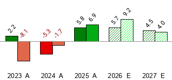 The Projected Sales Growth (F1/F0) looks at the estimated growth rate for the current year. It takes the consensus sales estimate for the current fiscal year (F1) divided by the sales for the last completed fiscal year (F0) (actual if reported, the consensus if not).