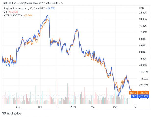 Flagstar has fallen 30% year-to-date and New York Community Bancorp has slid 28.7%. New York Community Bancorp is also at 52-week lows.