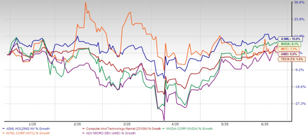 ASML Holding stock has also moved ahead of several semiconductor peers, including NVIDIA Corporation (NVDA - Free Report) , Intel Corporation (INTC - Free Report) and Advanced Micro Devices, Inc. (AMD - Free Report) . YTD, shares of NVIDIA, Intel and Advanced Micro Devices have risen 8.1%, 7.1% and 5%, respectively.