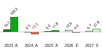 The Projected Sales Growth (F1/F0) looks at the estimated growth rate for the current year. It takes the consensus sales estimate for the current fiscal year (F1) divided by the sales for the last completed fiscal year (F0) (actual if reported, the consensus if not).
