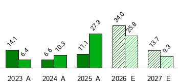 The Projected Sales Growth (F1/F0) looks at the estimated growth rate for the current year. It takes the consensus sales estimate for the current fiscal year (F1) divided by the sales for the last completed fiscal year (F0) (actual if reported, the consensus if not).