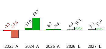 The Projected Sales Growth (F1/F0) looks at the estimated growth rate for the current year. It takes the consensus sales estimate for the current fiscal year (F1) divided by the sales for the last completed fiscal year (F0) (actual if reported, the consensus if not).