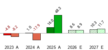 The Projected Sales Growth (F1/F0) looks at the estimated growth rate for the current year. It takes the consensus sales estimate for the current fiscal year (F1) divided by the sales for the last completed fiscal year (F0) (actual if reported, the consensus if not).