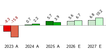The Projected Sales Growth (F1/F0) looks at the estimated growth rate for the current year. It takes the consensus sales estimate for the current fiscal year (F1) divided by the sales for the last completed fiscal year (F0) (actual if reported, the consensus if not).